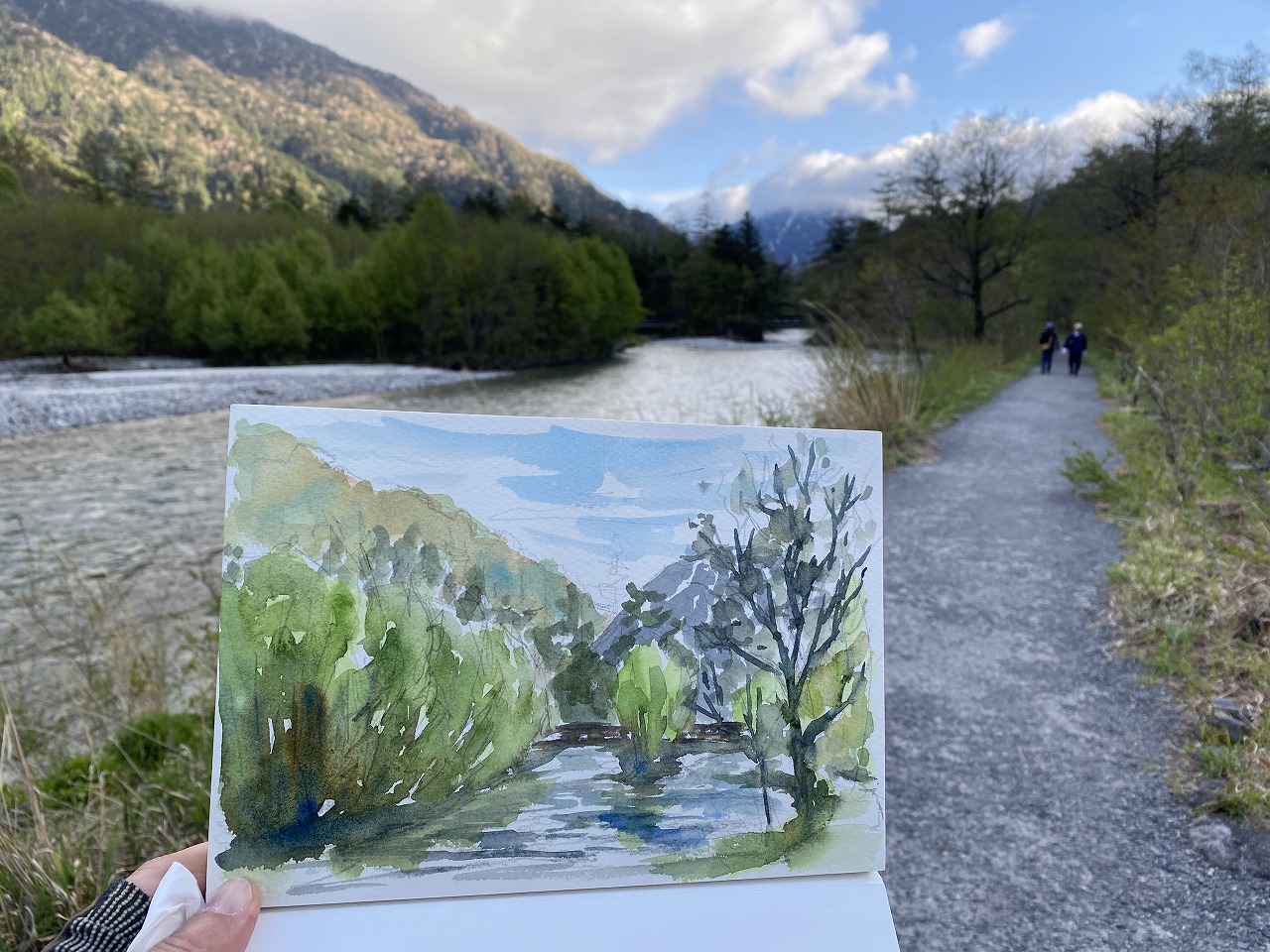 透明水彩スケッチ「春の上高地 暮どきの梓川」