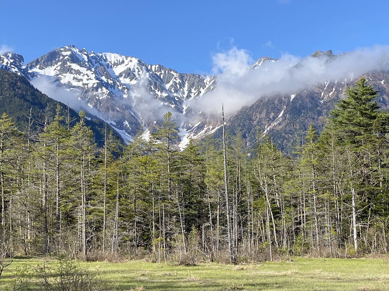 大正池からの道中も残雪の残る穂高連峰と芽吹きの木々が美しいコントラスト。