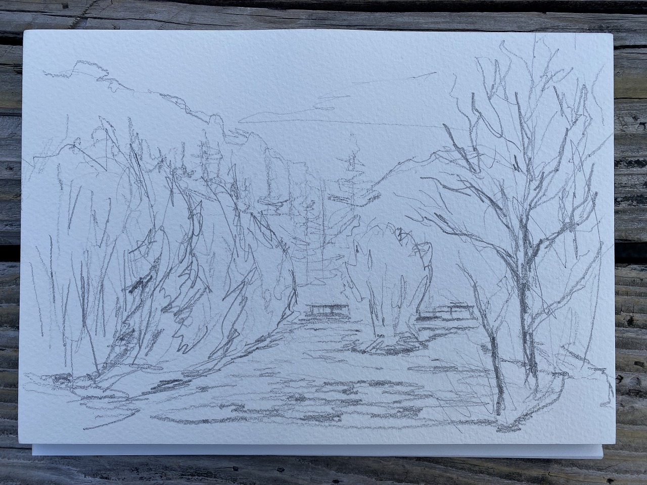 暗くなっても大丈夫なようにホテルの前から焼岳方面を見て短時間スケッチ。