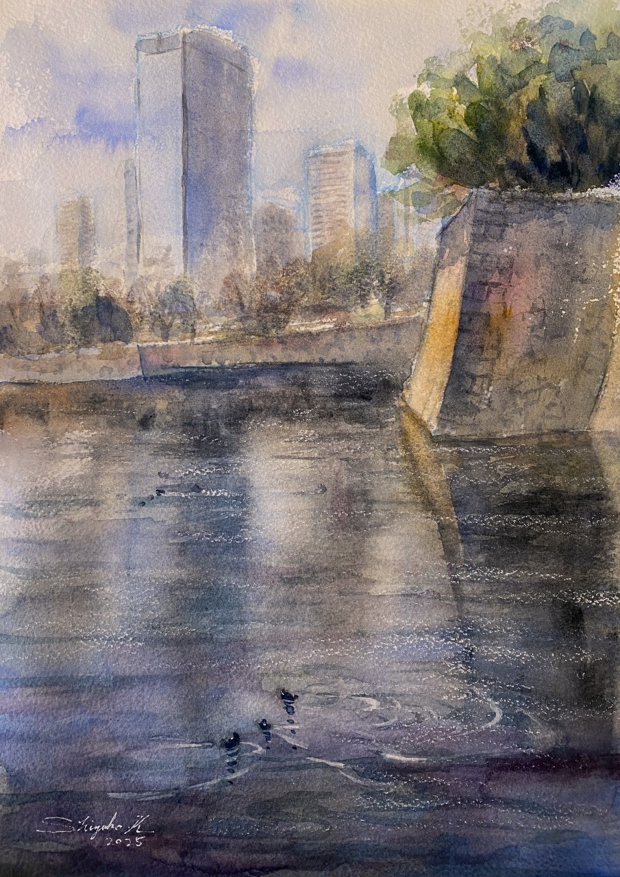 どんよりとした曇り空の大阪城。京橋のビル群とのコントラストがおもしろいと思い、この構図で描きました。