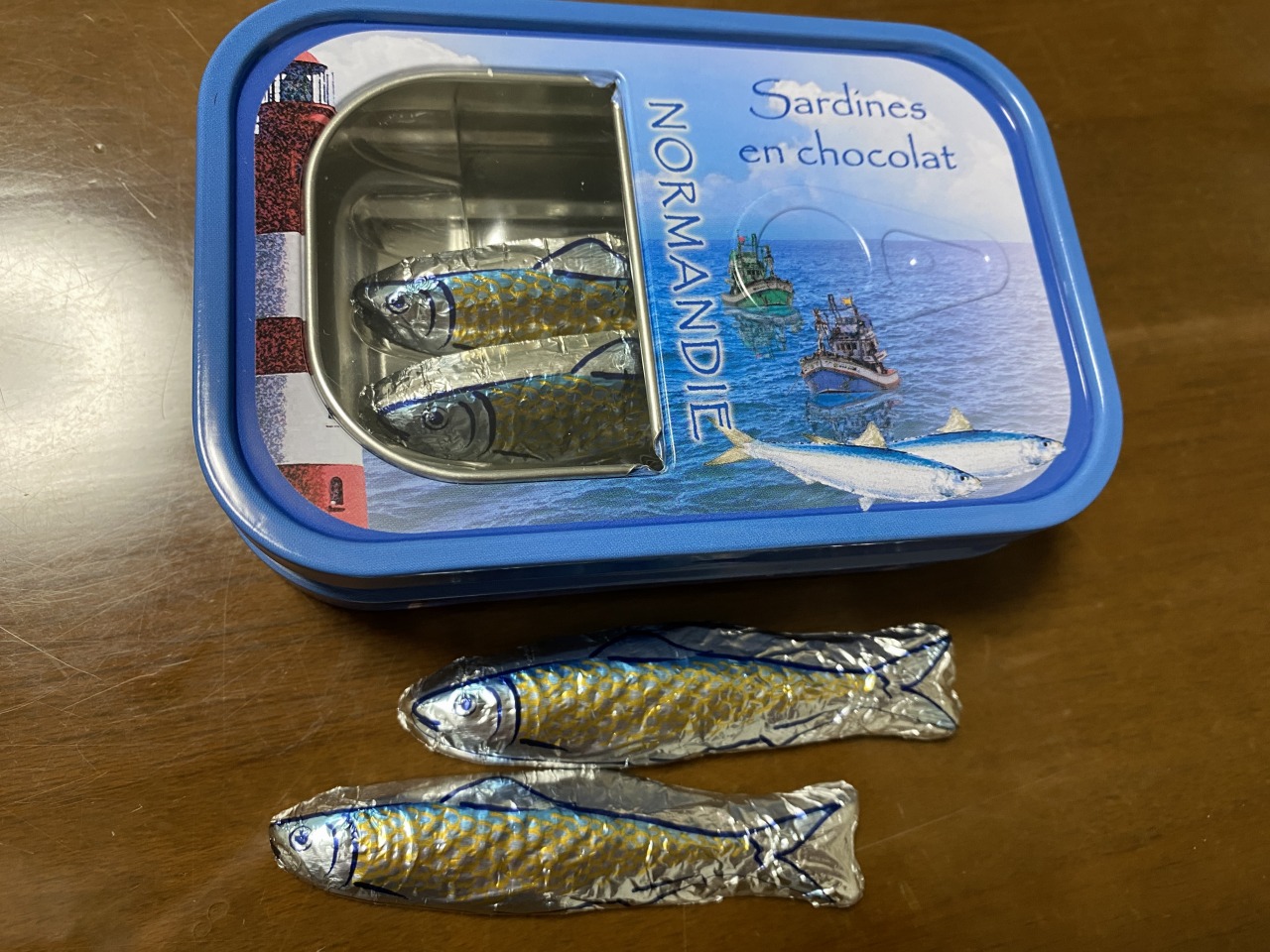 ノルマンディーのオイルサーディン風チョコレート。ほぼ上げ底で中身は全然なかったですが、缶のデザインが面白いと思って買いました。